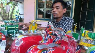 Agung Nugroho membuat kaleng bekas menjadi berguna. Kaleng-kaleng bekas itu kemudian dibikin kerajinan, seperti motor vespa, dll.